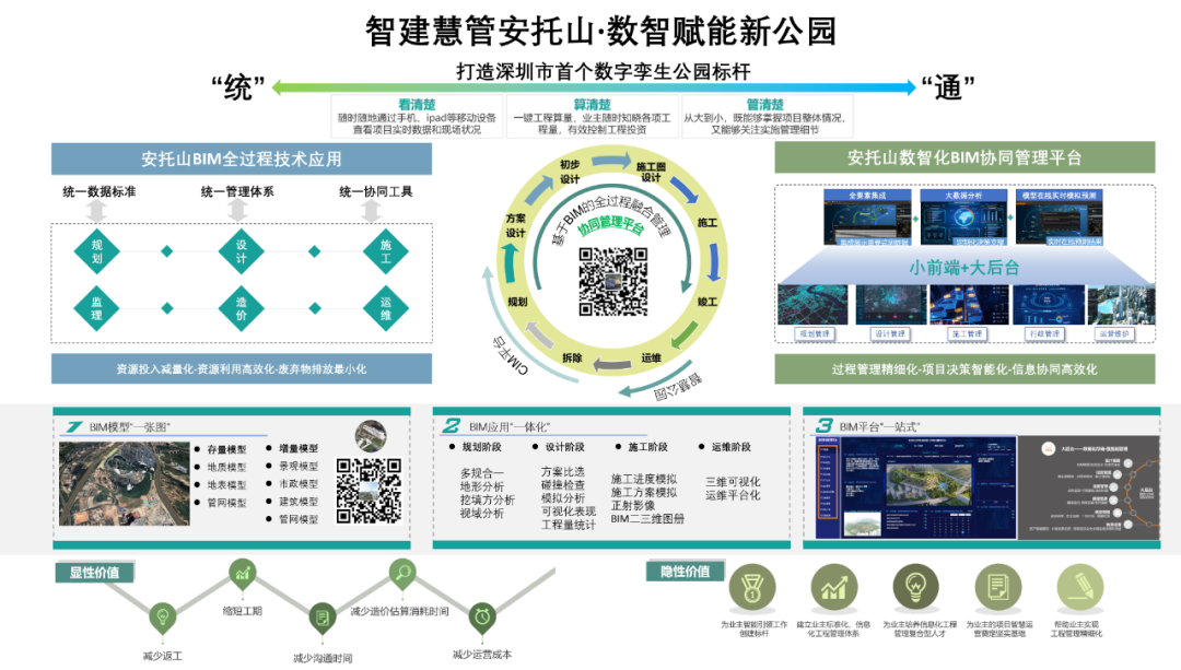 自《深圳市數(shù)字政府和智慧城市“十四五”發(fā)展規(guī)劃》發(fā)布之前,我司已優(yōu)先開啟以BIM技術為主的新技術參與項目全生命期過程,致力于將安托山自然藝術公園打造成深圳市公園城市和智慧城市的雙創(chuàng)樣板,提前布局建設數(shù)字孿生底座,自項目初始階段累積數(shù)字資產(chǎn),為深圳成為全球數(shù)字標桿城市助力,且積極開展宣傳活動,同時將數(shù)智化推向其他項目運用,推動華潤置地數(shù)字化轉型,將數(shù)智化運用實處,使數(shù)據(jù)具有意義,讓數(shù)據(jù)實現(xiàn)價值。