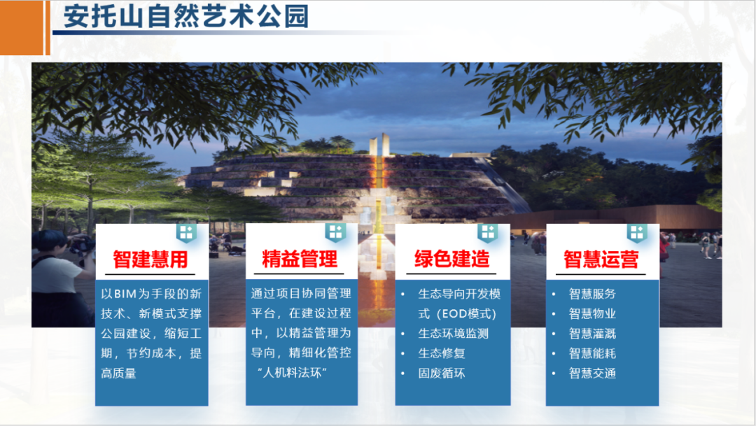 以智建慧管雙驅動的方式,以BIM技術為主的數(shù)字化新技術,將安托山自然藝術公園進行藝術與綠色地融合、藝術與智慧地碰撞,打造智慧安托山、掌中安托山。通過智慧管理、智能服務兩大體系,以運營為導向打造深圳首個數(shù)智孿生新名片,實現(xiàn)安托山綠色智慧建造的華麗轉身,成功將一座歷史遺留的采石場地蛻變?yōu)橐活w“綠色、藝術、數(shù)字”的智慧寶石,從深圳的公園體系中脫穎而出,熠熠生輝。