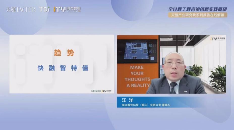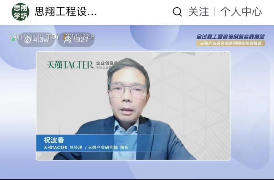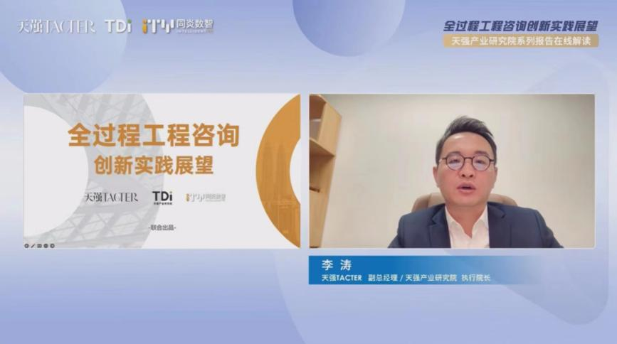2023年3月27日,天強(qiáng)TACTER所屬天強(qiáng)設(shè)計(jì)產(chǎn)業(yè)創(chuàng)新發(fā)展研究院與同炎數(shù)智科技(重慶) 有限公司聯(lián)合發(fā)布《全過(guò)程工程咨詢創(chuàng)新實(shí)踐展望》報(bào)告,并同步進(jìn)行在線解讀。天強(qiáng)管理顧問(wèn)總經(jīng)理祝波善主持會(huì)議,天強(qiáng)管理顧問(wèn)副總經(jīng)理李濤對(duì)該報(bào)告進(jìn)行了全面解讀,同炎數(shù)智董事長(zhǎng)汪洋就全過(guò)程工程咨詢的發(fā)展趨勢(shì)進(jìn)行了分享,近2000人進(jìn)行了線上觀看。