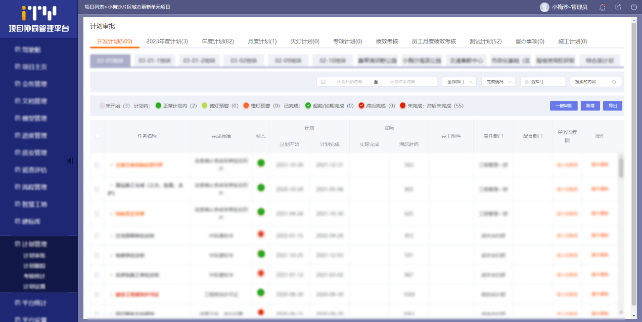 以圓滿完成工程建設(shè)為目標(biāo),根據(jù)“體系管理、制度保障、機(jī)制推動(dòng)、數(shù)智賦能”的指導(dǎo)思想,構(gòu)建適合小梅沙片區(qū)城市更新的“一心兩線八管理”工程管理體系,落實(shí)信息化建設(shè)管理,以終為始,貫徹全生命。后續(xù)更是為了加強(qiáng)計(jì)劃制定、計(jì)劃執(zhí)行、計(jì)劃跟蹤、數(shù)據(jù)分析等環(huán)節(jié)把控,順利落實(shí)“十四五”戰(zhàn)略規(guī)劃目標(biāo),同炎數(shù)智基于定制化定制小梅沙數(shù)字化管理平臺(tái)再次開(kāi)發(fā)計(jì)劃管理系統(tǒng),促進(jìn)對(duì)開(kāi)發(fā)計(jì)劃、年度計(jì)劃、月度計(jì)劃、專項(xiàng)計(jì)劃、績(jī)效管理等方面的加強(qiáng)管理,已達(dá)到強(qiáng)化目標(biāo)管控力度,降低工作成本,提升一體化協(xié)同辦公。