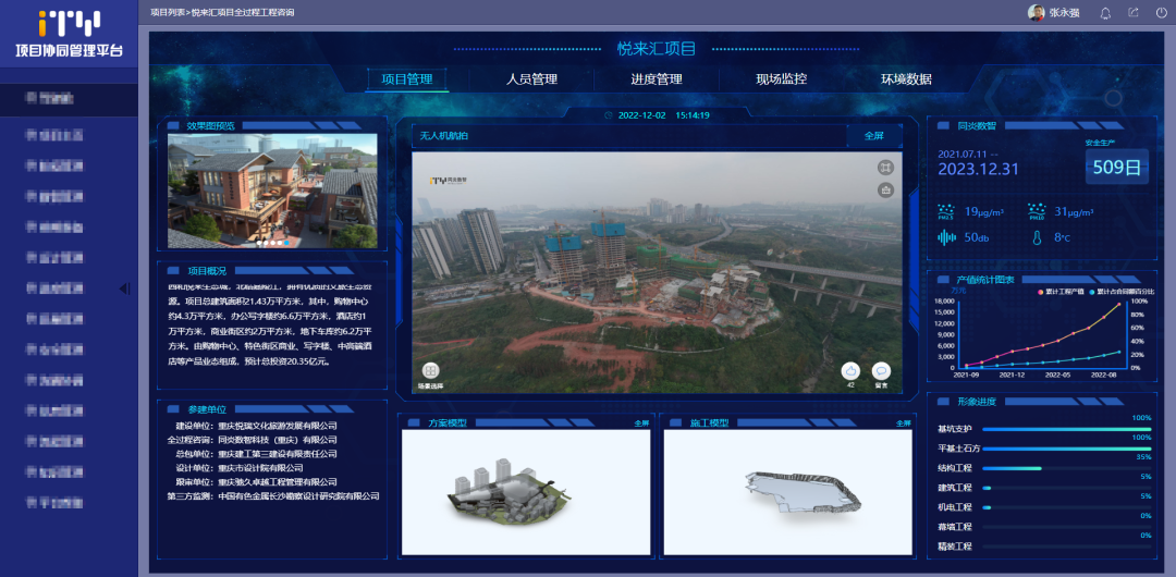 建設(shè)過程中,悅來匯項目利用多場景數(shù)智BIM應(yīng)用和協(xié)同管理平臺等手段進行施工管理。在土石方測算中,利用BIM技術(shù)代替?zhèn)鹘y(tǒng)方式進行測量,節(jié)省人力和時間的同時,保證了施工安全和測量精度;通過數(shù)據(jù)看板對項目質(zhì)量安全管理、進度管理、防疫管理、人員管理進行直觀把控,讓現(xiàn)場管理人員利用三維BIM模型進行現(xiàn)場驗收,提高了驗收效率及數(shù)據(jù)精度。同時融合無人機技術(shù)、GIS、管綜優(yōu)化、AR技術(shù)、建筑仿真分析等手段,充分發(fā)揮BIM技術(shù)的先行作用。